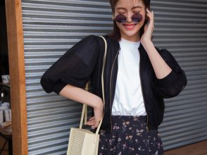靴¥13,200(コンバース)、ニット¥5,940(MURUA)、スカート¥6,600(リゼクシー)、バッグ¥14,900(CHARLES & KEITH)、ピアス¥20,680・リング¥15,620(ズットホリック<バルブス>)、サングラス¥19,800(スクリーンショット<ダブルラバーズ>)