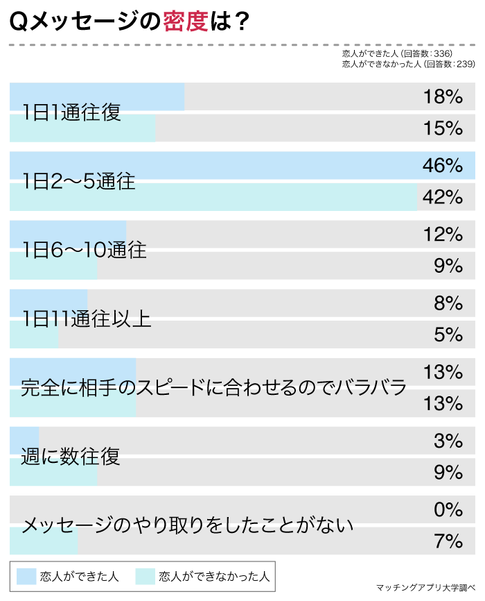それではメッセージの密度はどれくらいなのか聞いてみると、やはり恋人が「できた人」の方が頻繁に連絡をとっているようです。最低でも1日1往復はやり取りをする必要がありそうですね。