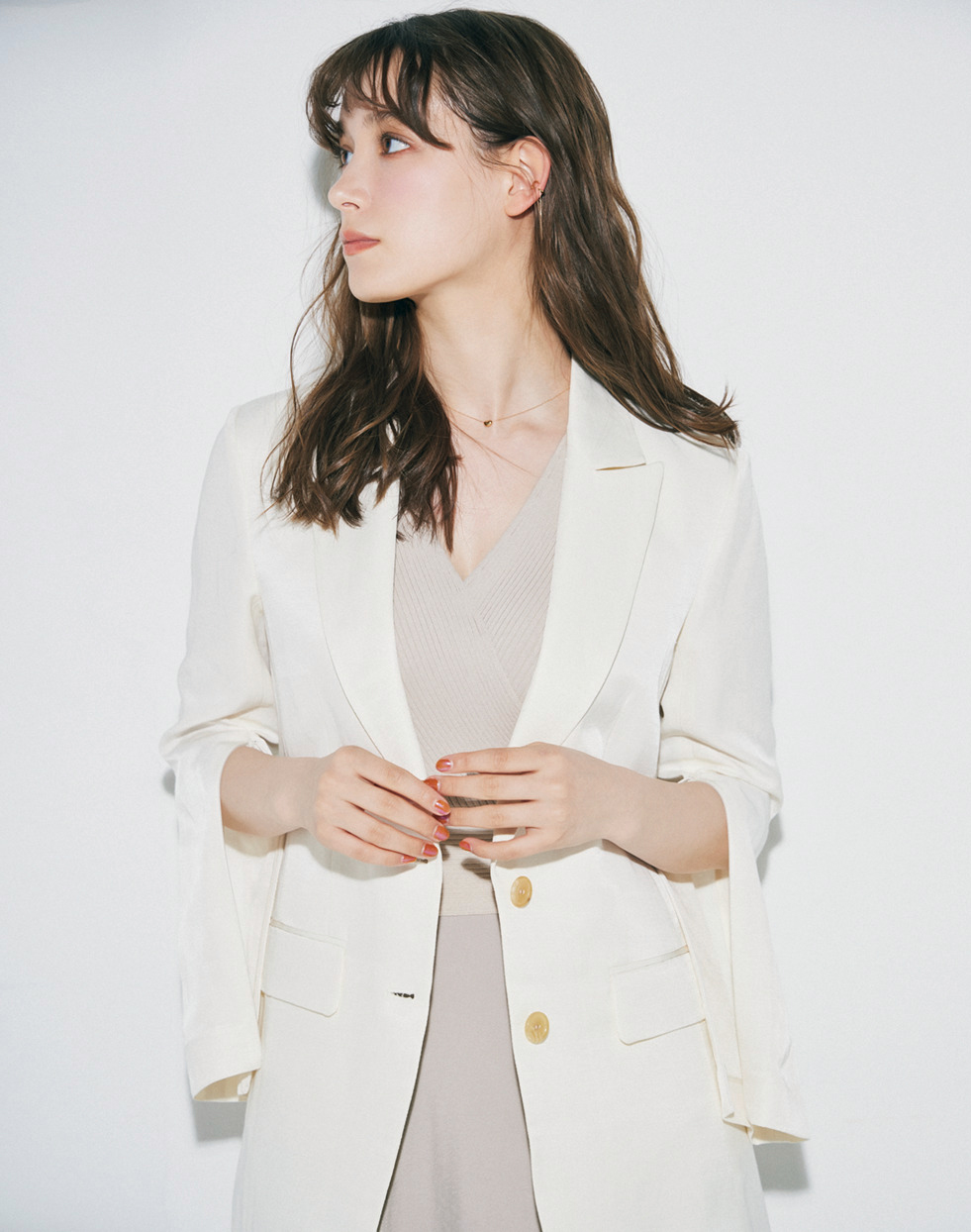 トラッドなディテールを踏まえつつ、袖のシルエットを変化させることで、モードな着こなしも叶うジャケットスタイル。ジャケットのきちんと感はありながら、肩パッドがないことでリラクシーな今どきムードも欲張りにGET♡ 素肌に馴染む華奢なネックレスやイヤカフで、品よくコーデを盛り上げて。