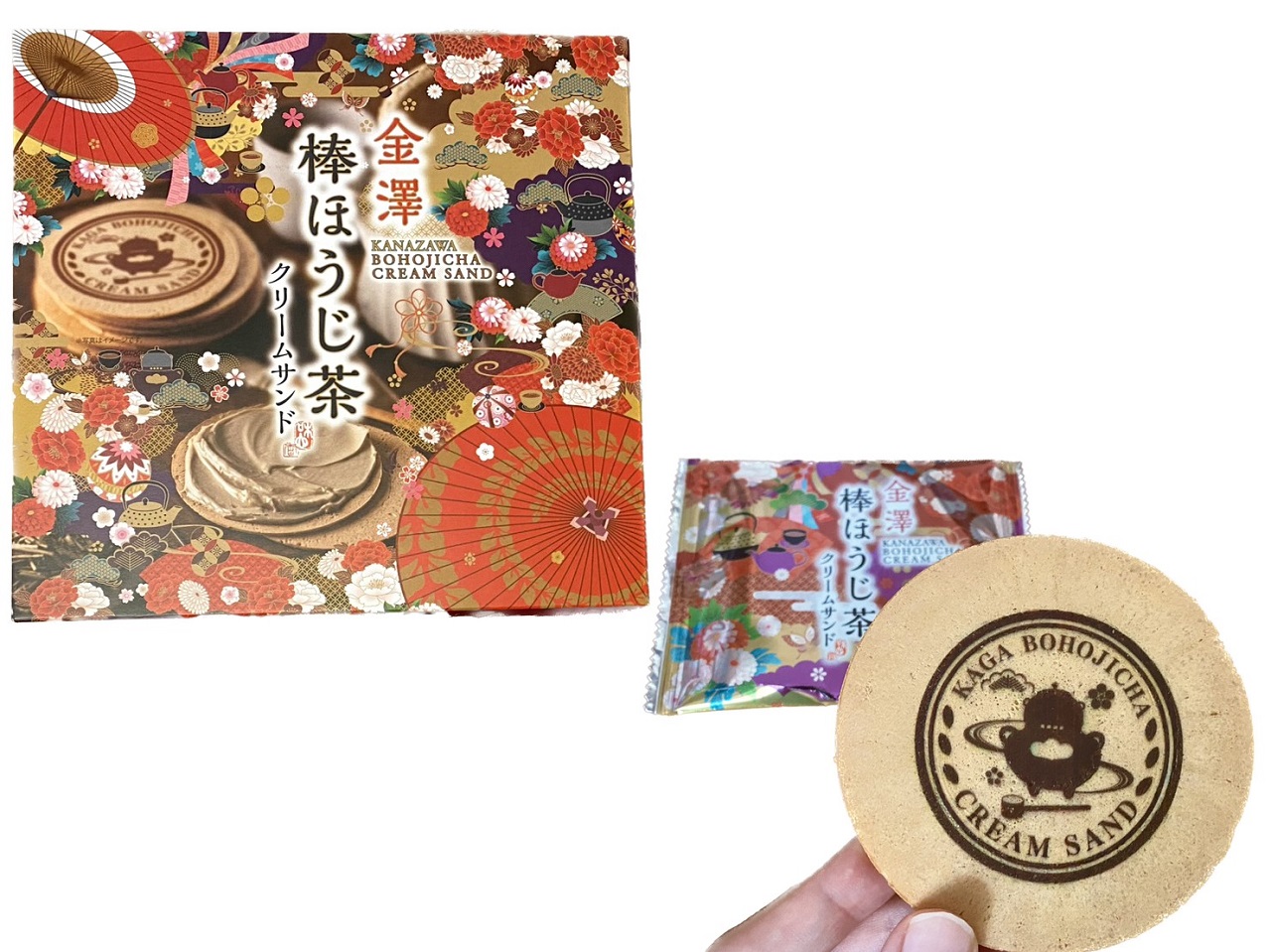 1品目は、「棒ほうじ茶クリーム」をうすく広げて挟んだサクっと軽い食感のクッキー。パッケージやクッキーの焼印の華やかなデザインがとってもステキ。