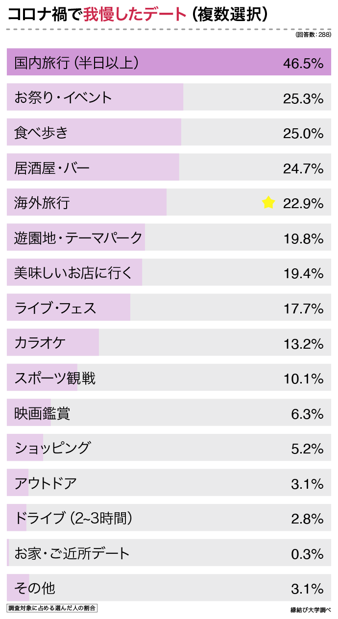 こちらが「コロナ禍にやりたかったのにできなかったデート」の結果!国内旅行、お祭り、イベント…と、やはり外出系のデートが上位を占めていますね♡