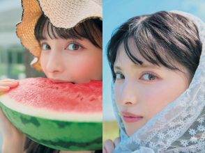 胸元が大胆に開いた白いハイレグ水着を着用したカットは、沖縄の夕暮れ時に撮影されたもの。あと数分で日が落ちる…という、少しエモーショナルなムードにマッチする気だるい表情に注目。