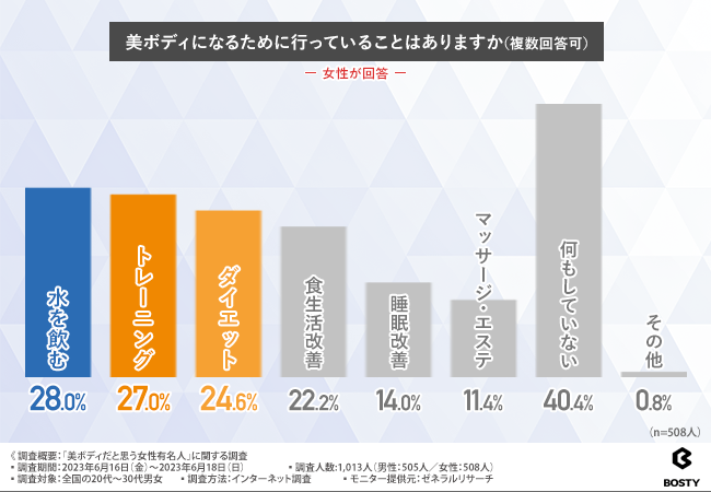 また「美ボディになるためにしていること」を尋ねたところ、トレーニングより多かった回答が「水を飲む」。また、4割の方は何もしていないという結果に。逆に言えば、始めたら美ボディになれる可能性があるけどまだ始めていない方も多い、ということですよね。半数以上の方はトレーニングや食生活改善などで美ボディを目指し、取り組んでいる模様。