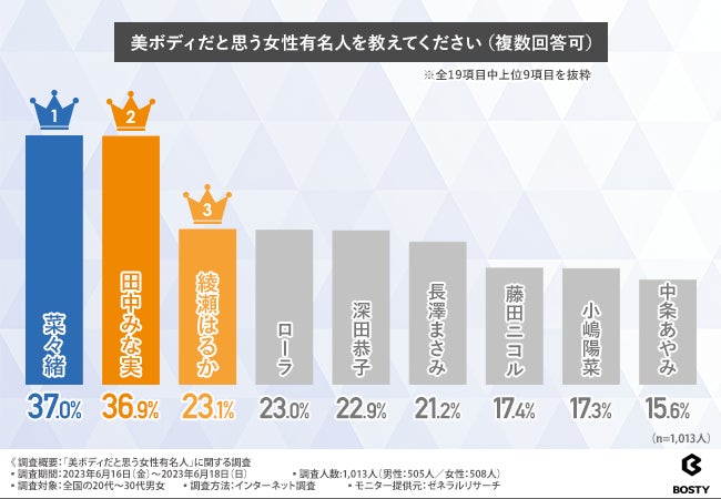 ボディメイクという言葉をよく耳にするようになりましたが、ただ細い身体を目指すのではなくほどよい筋肉をつけて美しいボディラインを意識する人も増えましたよね。みなさんも理想のボディとしている有名人がいるのではないでしょうか? 今回は、都内を中心にパーソナルジムを展開するBOSTYが全国の20代~30代男女を1,013名を対象に、「美ボディだと思う女性有名人」に関する調査を実施。その結果をご紹介します。