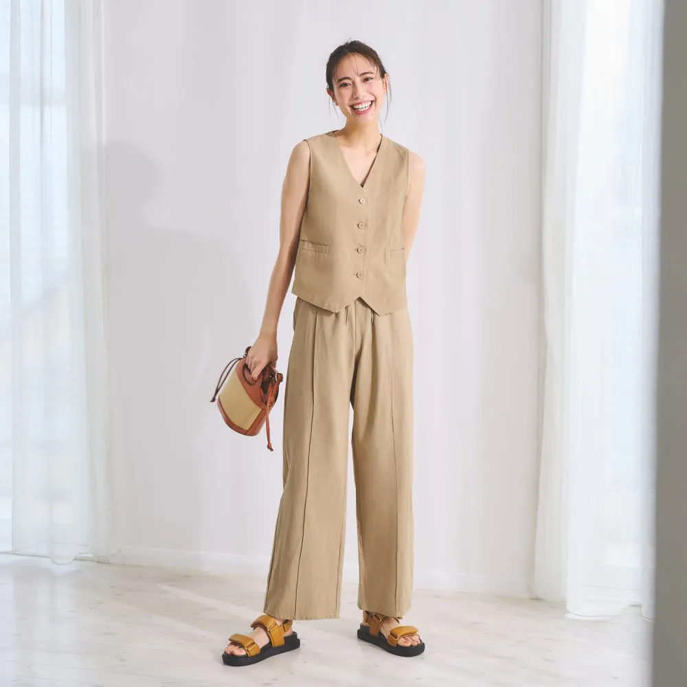リネン×ベストのセットアップがこなれ感たっぷり! 今季トレンドのベストはハンサムになりすぎない優しげなベージュがおすすめ。1枚ですっきり着ると今っぽいリラクシームードも演出できます。シューズなどの小物も同系色を合わせてワントーンに。
