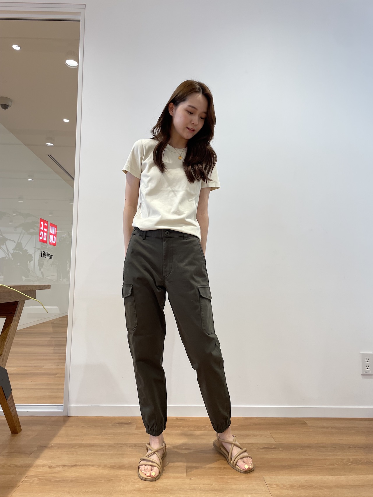 まず最初に試着したのは、程よいワイド感が特徴の「イージーカーゴパンツ」、色はオリーブ。サラッと軽やか&やわらかい素材なので、暑い日も涼しげで快適に着られるのが人気ポイント。