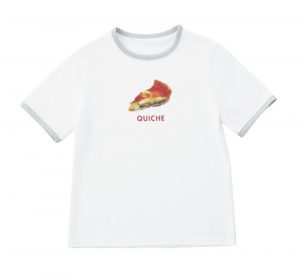 美味しそうな“QUICHE(キッシュ)”がプリントされたフォトTシャツ。袖や襟ぐりはミント色になっており、どこかレトロで古着のようなデザインと風合いが魅力♡ 気負わずに投入できるトリムTは、夏コーデのアクセントに。ミニボトムやデニム、ニットパンツなどを合わせて、80’Sのスクールガール風にキュートに着こなして。