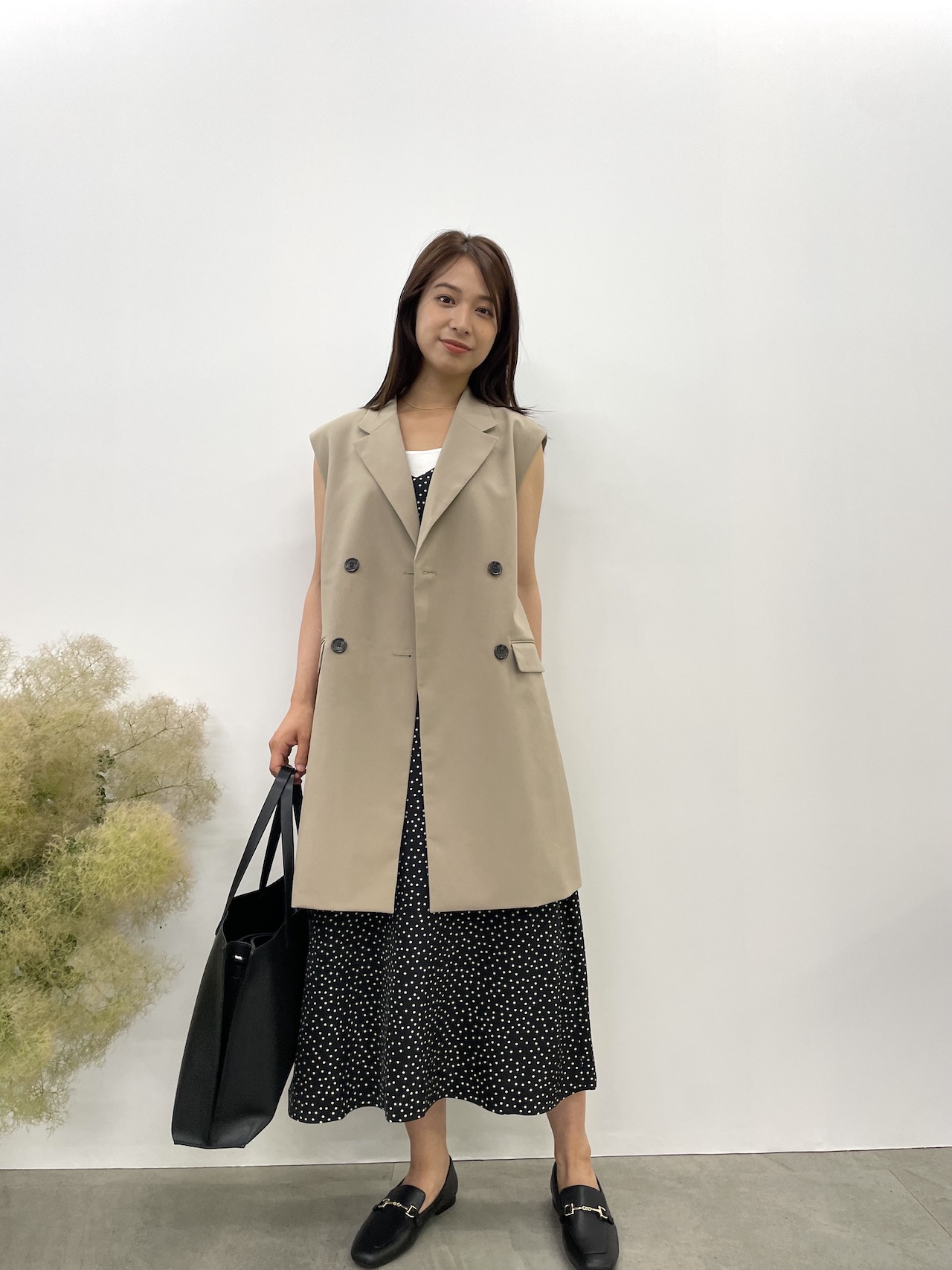 トレンドのジレをキャミワンピースにサラッと羽織れば、グッときれいめな通勤コーデに早変わり。辛口なジレはベージュを選ぶことで、まろやかさがプラスされ、品よく微糖な着こなしが叶います。