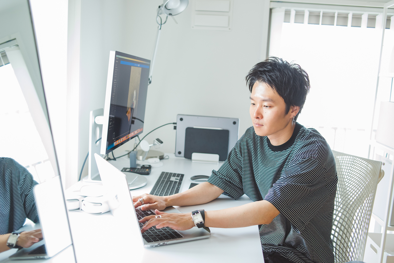 「オールブラックコーデのときは、トーンに微妙に差をつけたり、抜けのあるスタイリングを心がけています。小物も黒で統一しつつ、靴だけシルバーのスニーカーを合わせてエッジを効かせると都会的な雰囲気に。今日は展示会があるので、取引先の方や友人に会うことを想定して、親しみのあるきれいめカジュアルを選びました。
