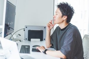 場所を取ってしまう収納棚は、フレームがスリムなデザインを選んで、ファイルボックスやプリンターはモノトーンで統一。とにかくシンプルにまとめるのが、スタイリッシュに魅せるコツ」
