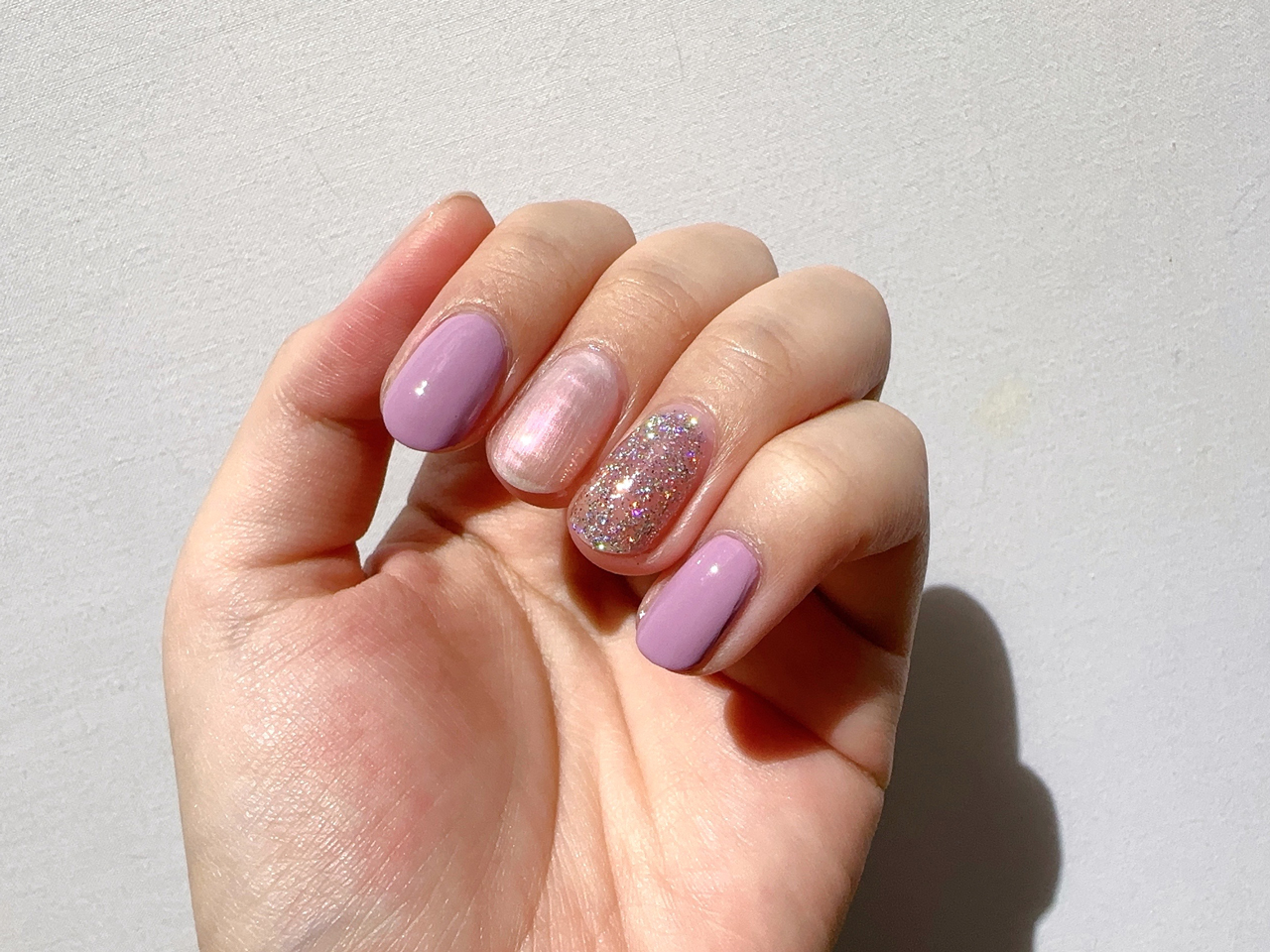 輝きが違いますよね! ツヤ感が出にくいラメのポリッシュにもキレイなツヤの膜が。