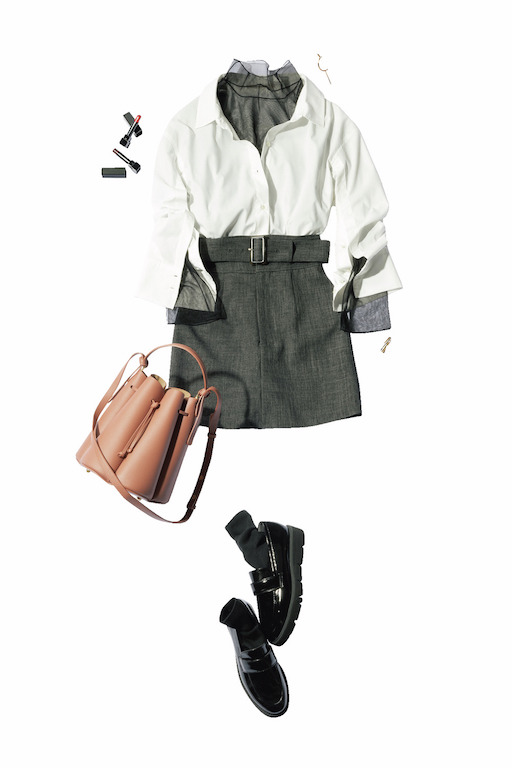 袖口スリットを開けても着られる白シャツは、チュールブラウスとのレイヤードで上級者な雰囲気に。露出のあるミニスカートの足元は、ソックス×厚底ローファーで重めにするのがおすすめです。