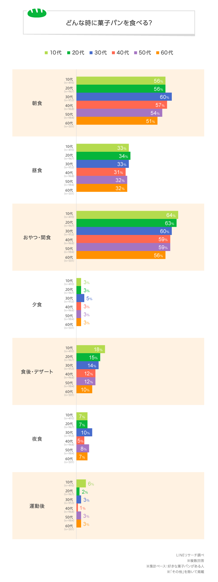 では、どんなときに菓子パンを食べるのでしょうか?好きな菓子パンがある人に聞いてみました。すると、全体では約6割の人が「おやつ・間食」で食べると回答し、もっとも高い割合となりました。次いで「朝食」という人が5割台後半、「昼食」が3割超で続いています。どちらかと言えば、がっつりと食事として食べるよりも軽く食べている人が多い印象を受けました。