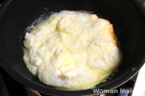 バターを敷いて、焼きます! あ、あれ……あんまり混ざってなかった……? ここにふたをして極弱火で3分くらい焼きます。