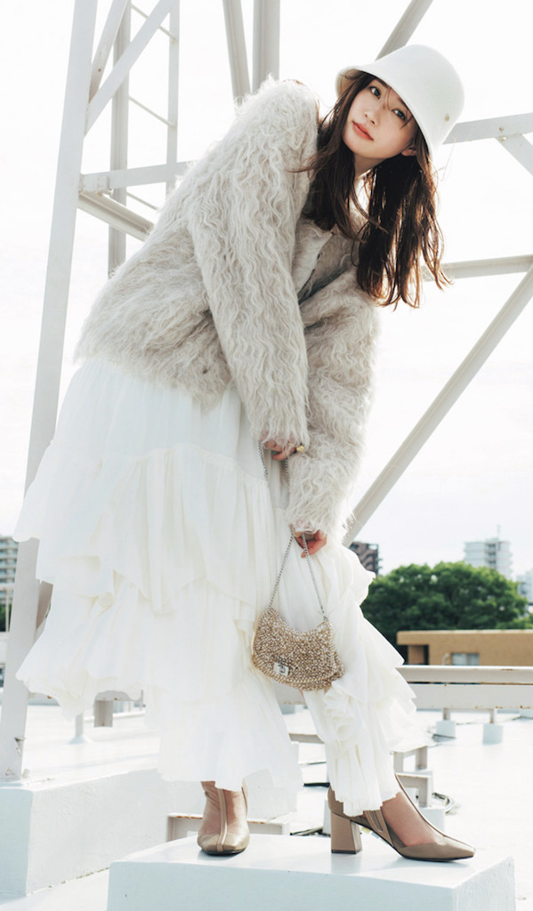 「甘めなワンピースのときこそキャスケットを合わせて程よくカジュアルなヘルシー感をON。プラスで甘くなりすぎないように、イヤカフをつけるのがポイント! 帽子は、ついブラックやホワイトを選びがちだけど、今回の撮影でグレーのキャスケットのかわいさに目覚めました」(by めるる)