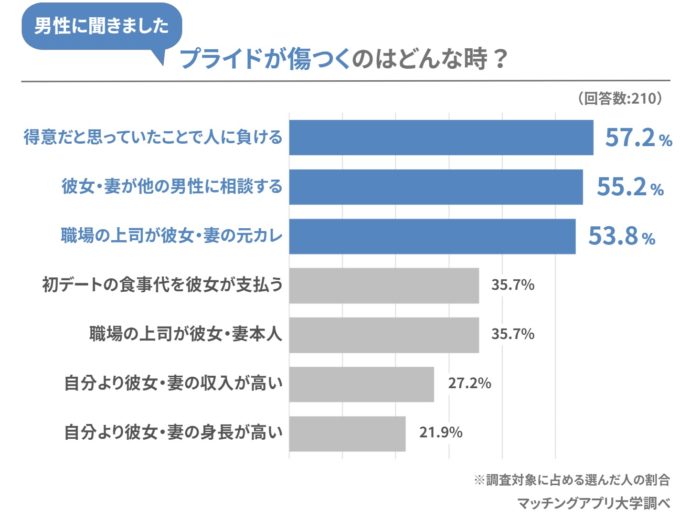 プライドはどんな場面で傷つくのか、男性に本音を聞いてみました。1位は「得意だと思っていたことで他人に負ける」の57.2%。2位は「彼女(妻)が他の男性に相談する」で55.2%。3位は「職場の上司が彼女(妻)の元カレ」の53.8%となり、上位3つはいずれも半数以上の男性が「プライドが傷つく」と回答しました(※複数回答)。