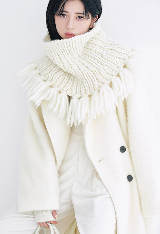 ひよりちゃんの小顔が隠れてしまいそうな、萌え感あるボリュームスヌードをオン。すらっとしたコートと合わせると洗練された印象に。