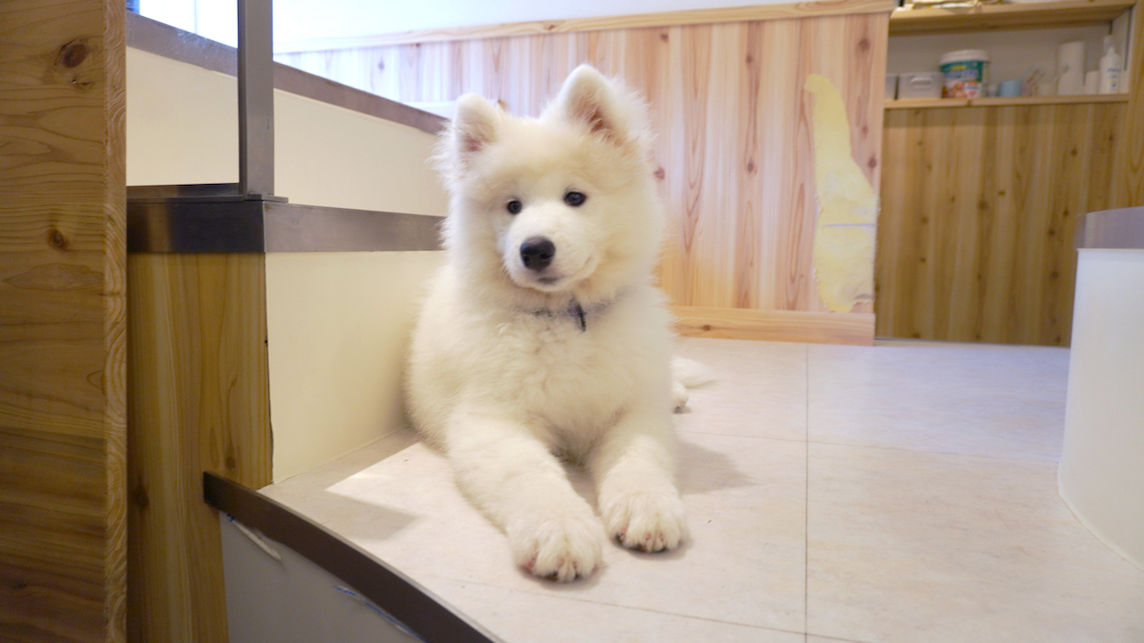 現在サモエドカフェ アルには、看板犬のアルちゃん(取材当時7か月)、仲よし3兄弟のおこめちゃん、もっぷくん、とうふくん(それぞれ当時5か月)、末っ子のわたげちゃん(当時4か月)の5匹が在籍中。