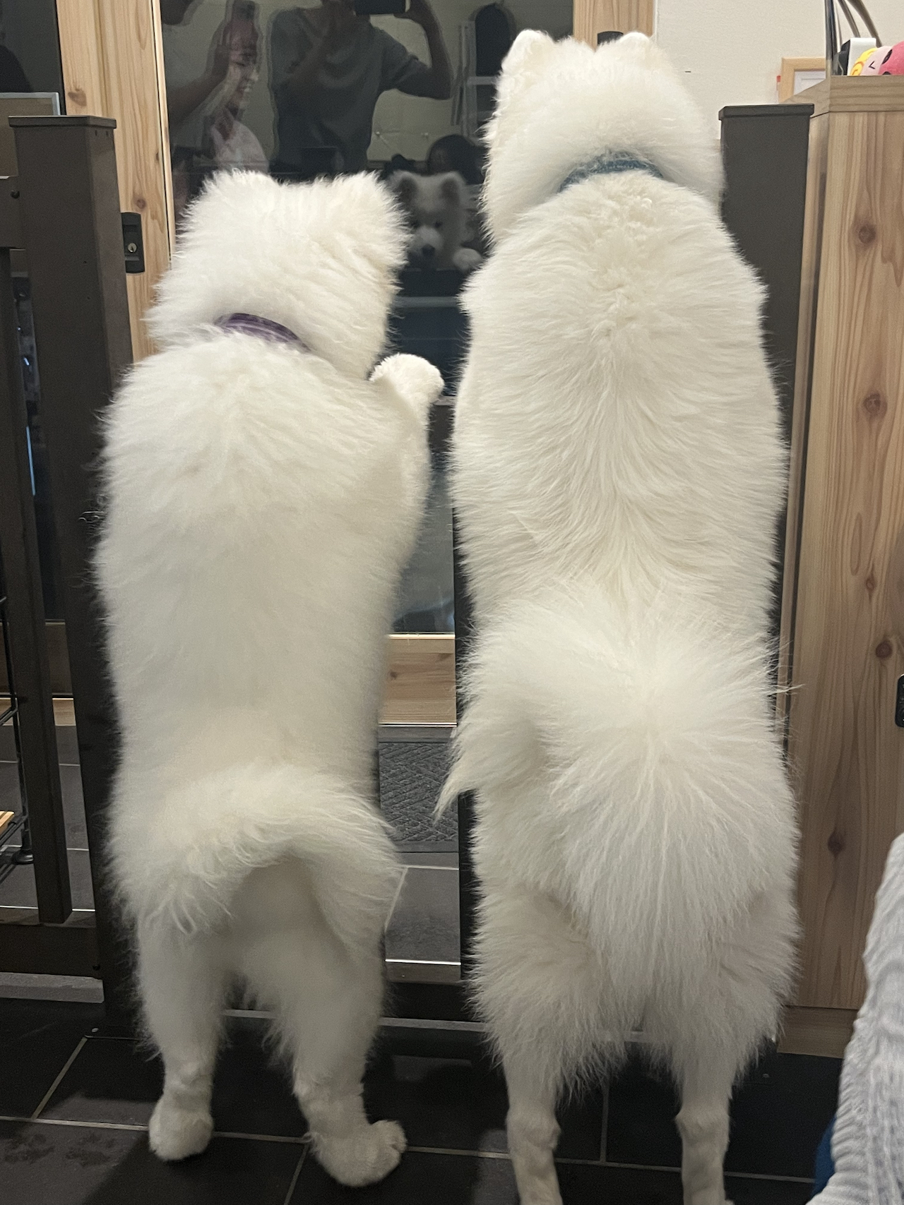 サモエドたちはみんな仲よしなので、誰かがお散歩に行って帰ってくると、この通りみんなでお出迎えタイムが始まります。