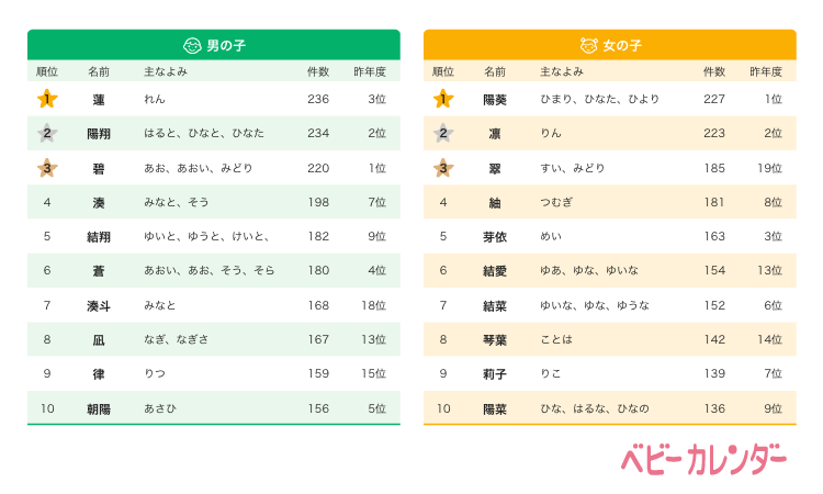 女の子の名前ランキングTOP3は、1位「陽葵」、2位「凛」、3位「翠」という結果に。1位の「陽葵」と2位の「凛」はどちらも2年連続で順位をキープ。4位の「紬」は、昨年8位から一気にランクを上げました。さらに、「結愛」は昨年13位から6位へ、「琴葉」は昨年14位から8位とそれぞれTOP10入りを果たしています。女の子は和風なイメージを持つ名前の人気が根強いようですね。