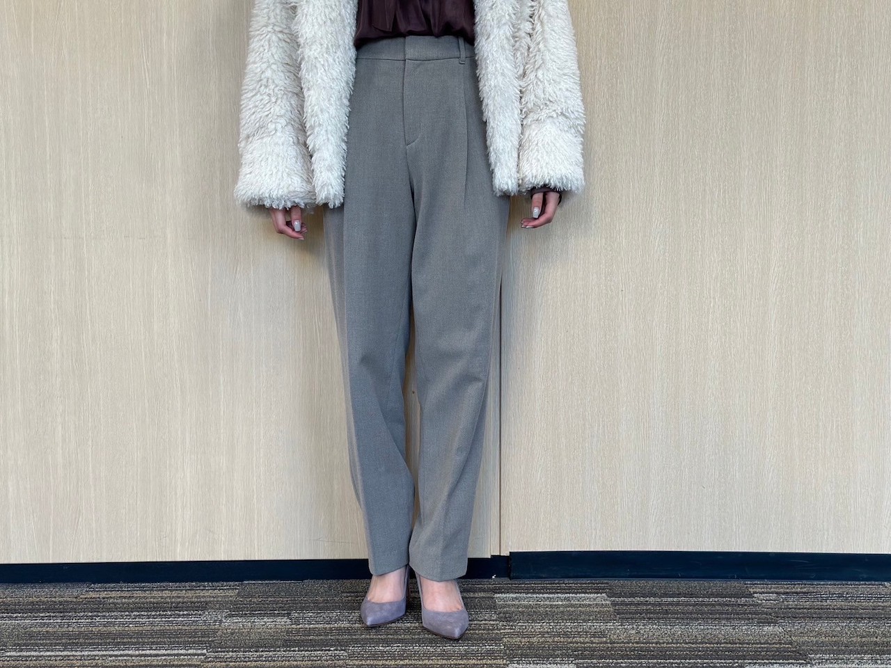 きちんと見えるグレーのパンツは、ユニクロで¥4,990。程よくワイドなシルエットは、きれいめもカジュアルも、テイスト問わず着回せます。