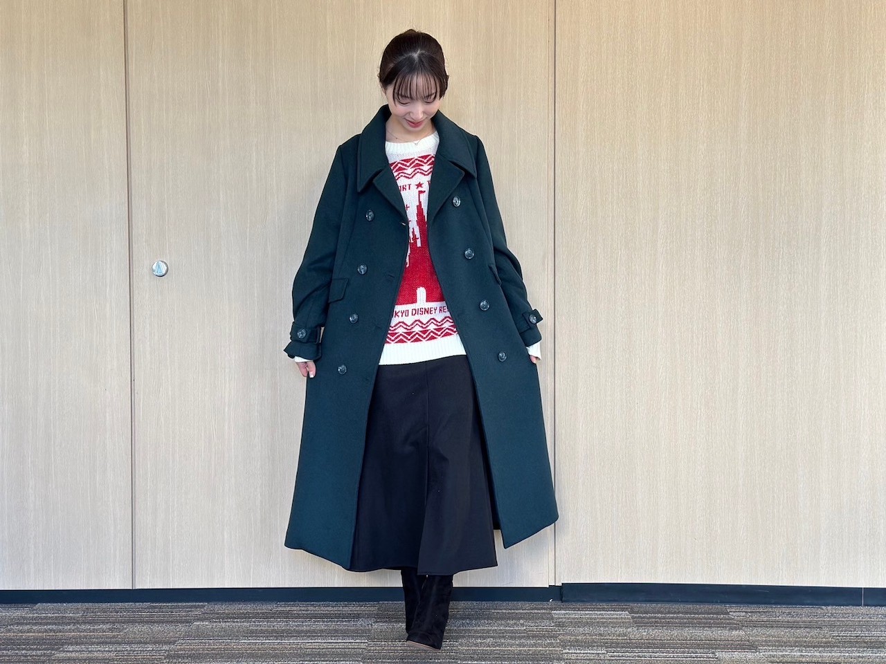 レトロかわいいディズニーのニットにボルドーとグリーンのコートを羽織った、クリスマスリンクコーデ♡ おでかけやパーティなど、楽しい予定がさらに盛り上がること間違いなし!