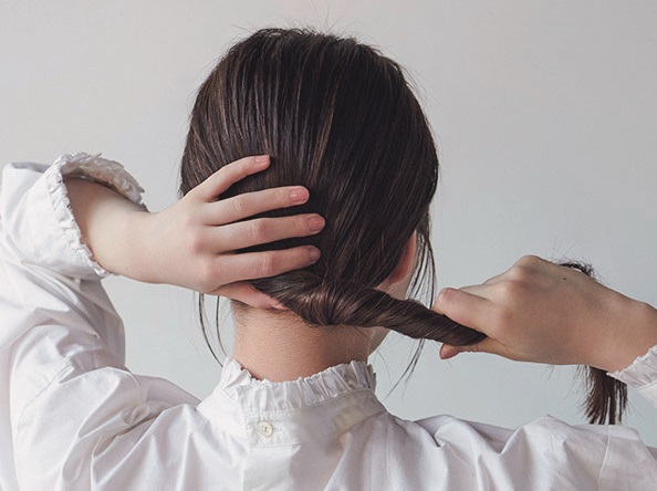 ①バームを適量取って手にのばし、髪全体になじませる。顔周りの毛を残し、後ろの下の位置で全体をまとめ、毛束をねじる。