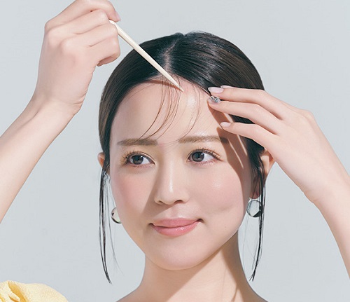②指に残ったバームで分けた前髪をかきあげるように前髪をまとめながらサイドに流す。