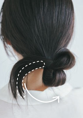 通した毛先の半分のみとり、おだんごの下から反対側に回す。