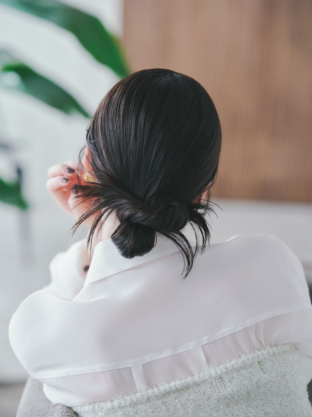②後ろでまとめてシュシュで結ぶ。トップ部分の毛を少しずつ引き出し、ほんのりボリュームをもたせて。