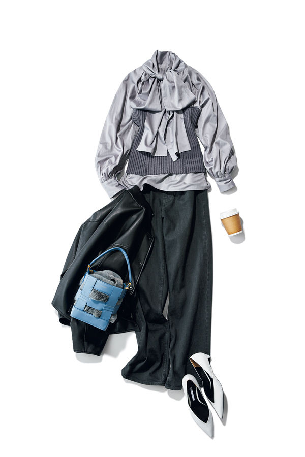 濃淡のあるグレーボウタイブラウス×ビスチェのきれいめトップスでリモート映え。デニムボトムも黒を選べばきれいめな印象に。
