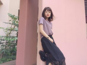 肩の落ちたラインが特徴のドロップショルダー。メンズライクな雰囲気を、スカートとあわせて、あえて女らしく着こなすのがポイント。着やせ効果も高いので、ぜひ一度トライを。Tシャツ¥4,600(リエス)