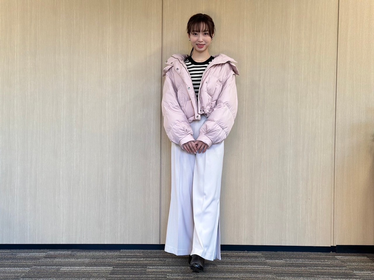 遠くからでも目を引くパステルピンクのダウンコート。かわいさたっぷりなので、合わせのアイテムはボーダーニット&ワイドパンツでキレよく! ちょうどよく甘めなカジュアルコーデに仕上がります。