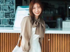 薄手に見えてしっかり裏地付きのブラウスは、ビッグリボンがスイートな分、落ち着いたオリーブブラウンで程よく糖度オフ。ワントーンでそろえたワンピレイヤードで、品よしモテコーデのできあがり!