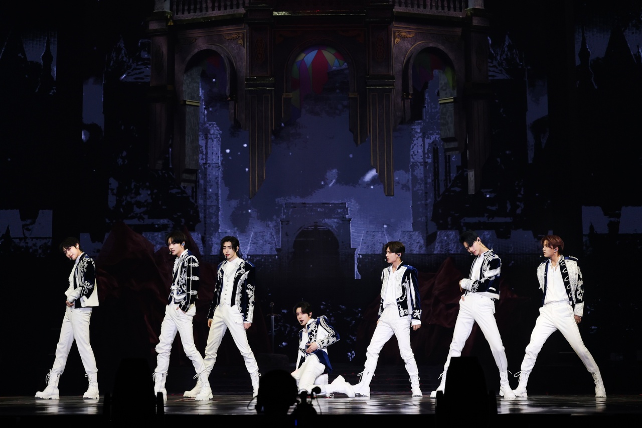壮大な世界観の中、白の上下に、王子様のようなジャケットで登場した7人。『Drunk-Dazed』からスタートし、色気のあるダンスパフォーマンスで会場は一気に熱気に包まれました。続けて『Blockbuster』を披露すると、「久しぶりにソウルに戻ってきました」とリーダーのJUNGWON、そしてメンバーたちも挨拶。JAYはこの日体調不良でしたが、「JAYは、ENGENE (読み方:エンジン、ファンの総称)に会いたくてステージに上がりました。JAYのためにいっぱい叫んで〜!」とJUNGWONが会場に呼びかけました。その後、『Let Me In (20CUBE)』、『Flicker』、『FEVER』、さらに昨年にリリースされた5th Mini Album『ORANGE BLOOD』の収録曲『Still Monster』を披露。