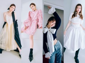 【めるる】一度は夢見る憧れのドーリーシルエット。ツヤ感とボリューム感が、より一層スペシャルな気分にさせてくれる♡ ワンピース¥77,000(H30 Fashion Bureau<ディサヤ>)、トップス/参考商品(アンティローザ<yae>)、バッグ¥45,100[参考価格](GANNI)、靴¥9,990(ザラ)、ヘアピン[リボン]¥880(アネモネ/サンポークリエイト)、ピアス¥11,880(ズットホリック<マルシア・モラン>)、リング[左手・右手中指/3点セット]¥28,600・[右手人さし指]¥28,600(ケイト・スペード<ケイト・スペード ニューヨーク>)、ヘアピン[ゴールド]/スタイリスト私物