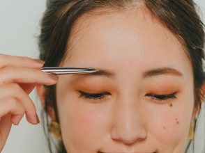 眉を少しずつつまみ、眉尻に向けてスライド。