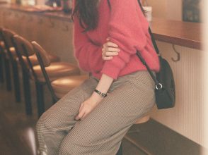 ジャケット¥25,300・パンツ¥15,400(AOKI<LES MUES Femme>)、ニット¥26,400(ウメダニット<ラッピンノット>)、バッグ¥45,100(マイケル・コース<マイケル マイケル・コース>)、靴¥19,250(ダイアナ 銀座本店<ダイアナ>)、ピアス¥7,700(アビステ)、バングル[3連]¥49,500(エナソルーナ)