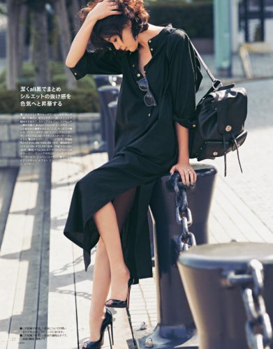 重くなりがちな黒のロングワンピースは、ルーズに開いた胸元と、足さばきのよい深いスリットで軽快さを加えて。カジュアルなリュックでもレザー素材を選んで、足元はピンヒール、どこかキリッとした都会的な要素を加えることで、いまっぽさが備わります。