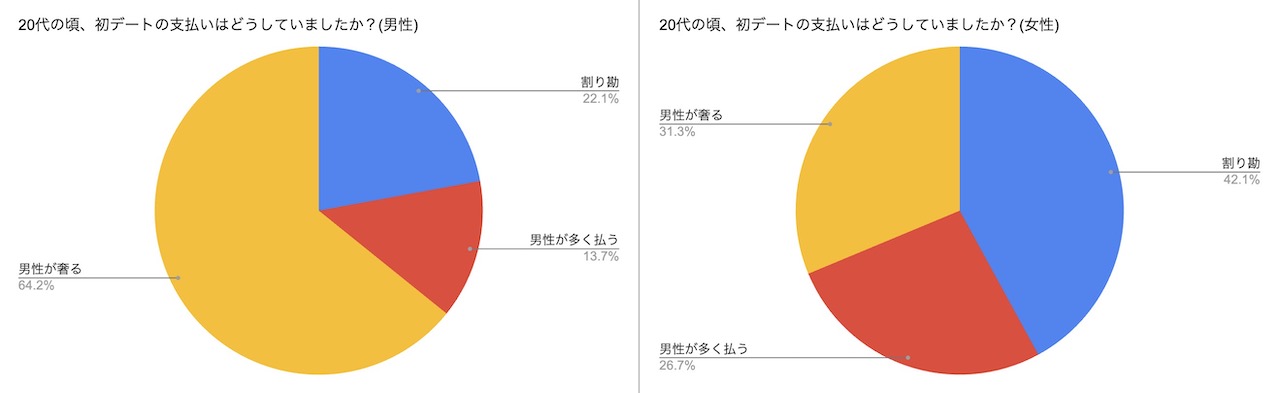 まず、20代の頃に経験した「初デート」時の支払いはどうしていたのかについて、男女別に見てみましょう。