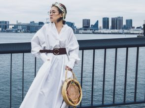 【右/楓】ワンピース¥14,300(COCO DEAL/ココ ディール)、ブルゾン¥35,200(LOUNIE/ルーニィ)、バッグ¥17,600(セムインターナショナル<AULENTTI>)、靴¥29,700(銀座かねまつ6丁目本店)、ピアス¥17,050(ジェンマ アルス<gemma alus>)、リング¥9,680(ズットホリック<フル・オブ・グレイス>)