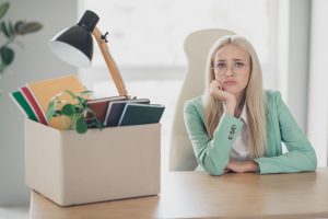 • Photo,Of,Unhappy,Upset,Woman,Dressed,Teal,Blazer,Collecting,Belongings