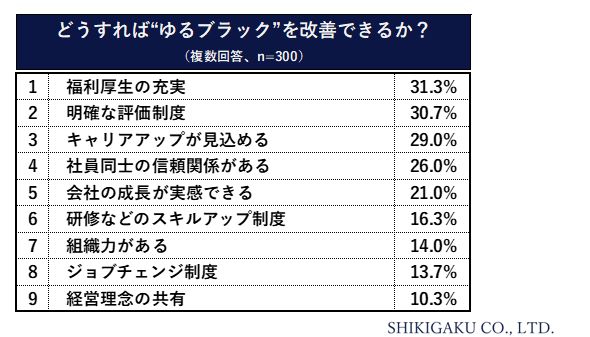 次に、“ゆるブラック”を改善するにはどうすればよいかについて聞いたところ、最も多かったのは「福利厚生の充実」31.3%で、そのあとに「明確な評価制度」30.7%、「キャリアアップが見込める」29.0%と続きました。