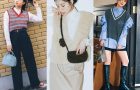 ニットベストにシャツ、パンツを合わせたきれいめコーデは、オーバサイズトップス×フレアパンツのシルエットで新鮮に。ゴールドのアクセやサングラスでコーデ感を盛ると、定番のモノトーンがおしゃれっぽく決まります。足元はハイカットのスニーカーであえてラフに振るのがポイント。ブラウンのバッグを合わせれば、コーデにおしゃれなリズムが生まれます。