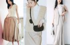 ベスト×フレアスカートのボリューミーなシルエットと、白インナーのメリハリで全身バランスを意識。女っぽいベージュ×ホワイトの配色は、好感度も抜群です。スエードパンプスやキルティングバッグの素材感で、ワントーンコーデに奥行きをプラスして。