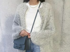 涼しくなってきたら、Gジャンの上にアクセ感覚でカーデを巻いて小洒落たアクセントに。ブーツとカゴバッグ、季節MIXなテンションも上級見えの秘訣。