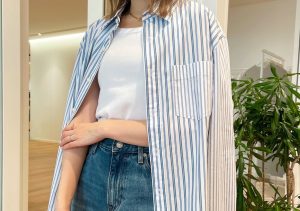 タックインもアウトも一枚でサマになるのは、ゆるすぎずピタッとしすぎずなサイジングのおかげ。ワンピースにレイヤードしたり、夏以降はジャケットや羽織りのインナーとしても活躍します!