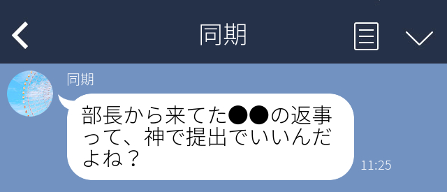 「同期:部長から来てた●●の返事って、神で提出でいいんだよね?