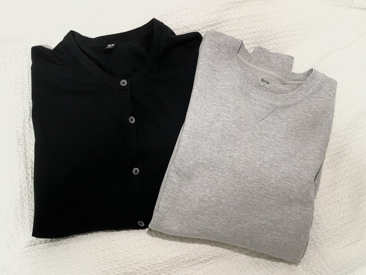 ↑ユニクロの薄手のカーディガン(左)は羽織ってもよし、肩掛けしてもよし、嵩張らない生地感はカバンに忍ばせて置いてもよしで使い勝手抜群。ず〜っと着てます。スウェットシャツ(右)は最近買い替えたものの、数年に渡り愛用♡