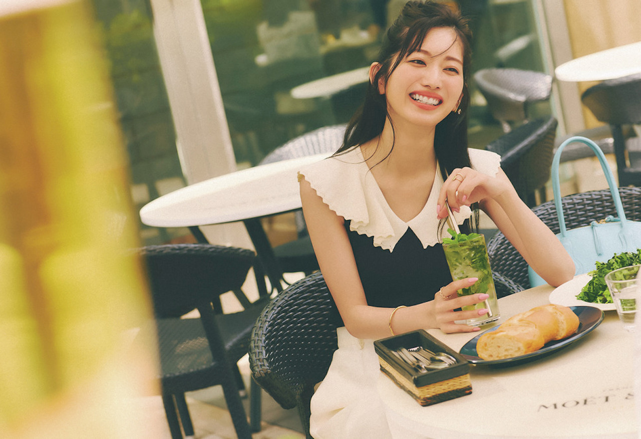 フリルは、ニットとシフォンプリーツの異素材使いでより立体的に。甘盛りトップスの鉄板ボトムは、やっぱりすっきり見えるテーパードパンツ。INして微糖な甘さで着こなしたい。白とテラコッタの夏色配色で、ハツラツとした印象に!